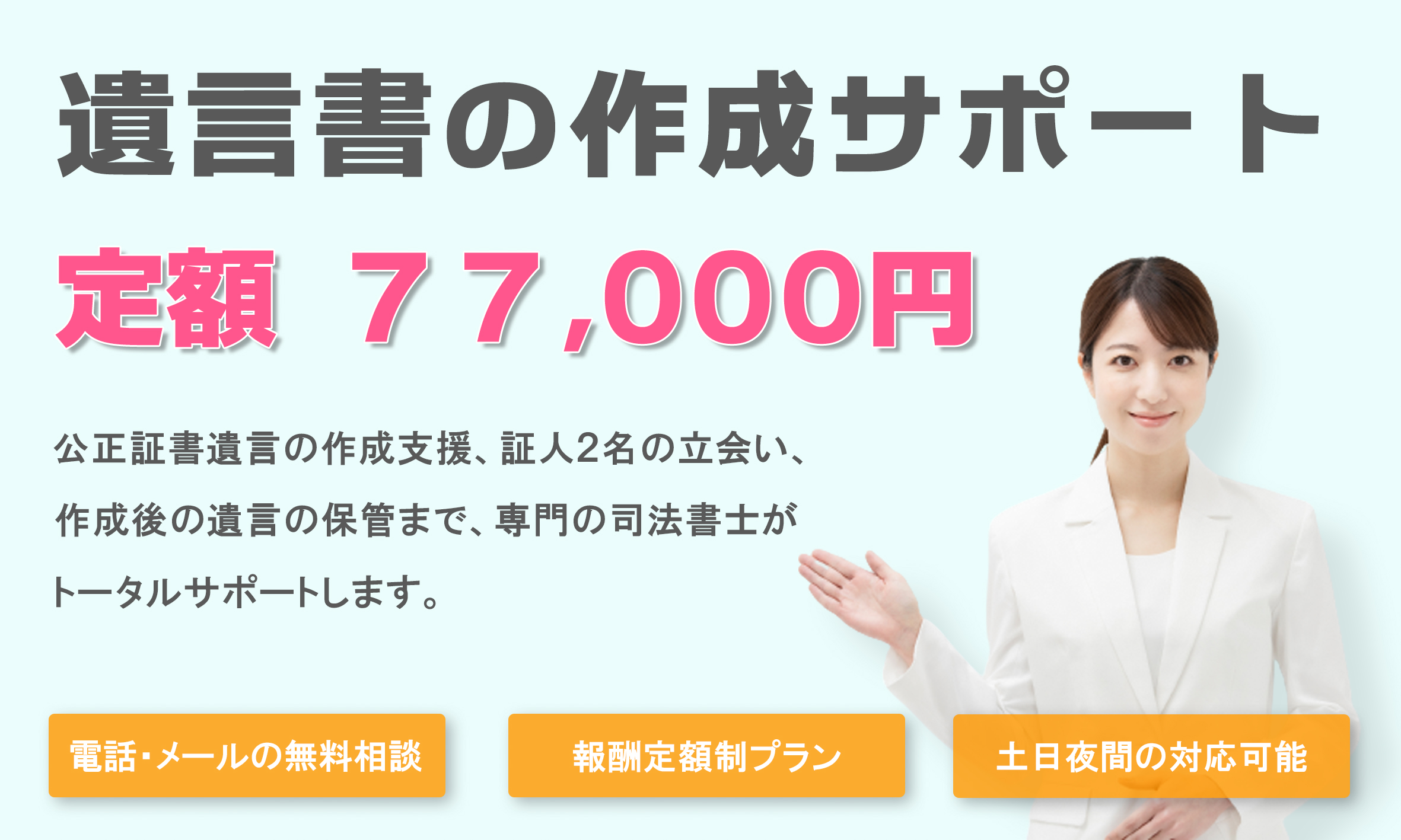 - 公正証書遺言作成に必要な証人2名も無料でお引き受けします。